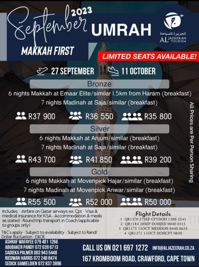 Disclaimer: Kindly check and confirm details with operators before booking. Package Information has been uploaded onto our website as received, and may have changed. Hotel Information has been sourced from websites like Google Maps, Wikimapia and Hotels.com. If any of the information is incorrect, kindly let us know via email: info@hajjumrahinfo.co.za - Shukran