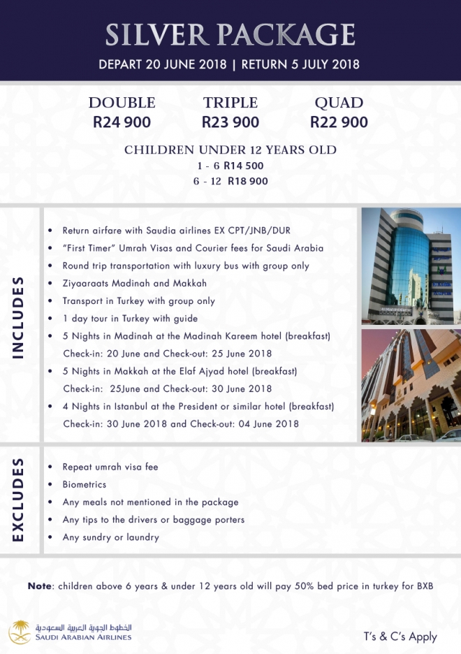 Disclaimer: Kindly check and confirm details with operators before booking. Package Information has been uploaded onto our website as received, and may have changed. Hotel Information has been sourced from websites like Google Maps, Wikimapia and Hotels.com. If any of the information is incorrect, kindly let us know via email: info@hajjumrahinfo.co.za - Shukran
