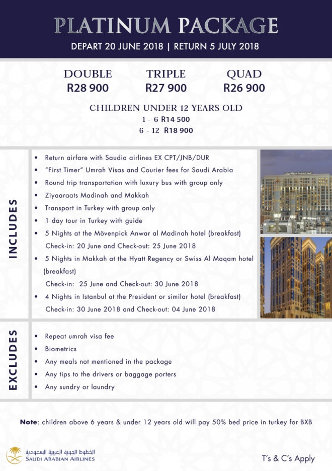 Disclaimer: Kindly check and confirm details with operators before booking. Package Information has been uploaded onto our website as received, and may have changed. Hotel Information has been sourced from websites like Google Maps, Wikimapia and Hotels.com. If any of the information is incorrect, kindly let us know via email: info@hajjumrahinfo.co.za - Shukran