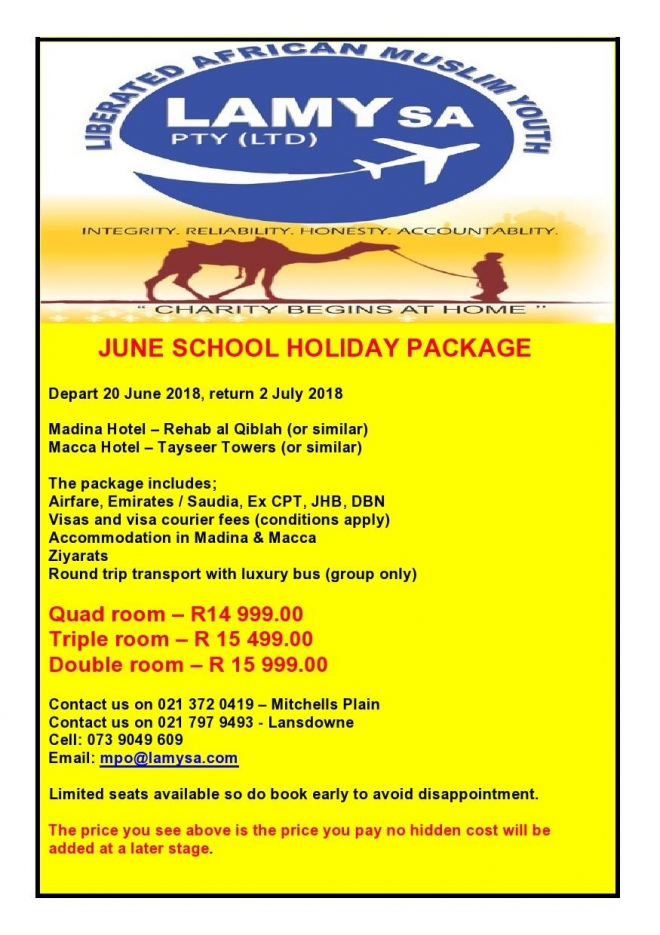 Disclaimer: Kindly check and confirm details with operators before booking. Package Information has been uploaded onto our website as received, and may have changed. Hotel Information has been sourced from websites like Google Maps, Wikimapia and Hotels.com. If any of the information is incorrect, kindly let us know via email: info@hajjumrahinfo.co.za - Shukran