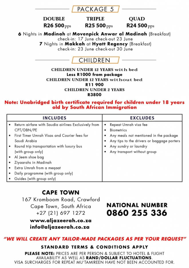 Disclaimer: Kindly check and confirm details with operators before booking. Package Information has been uploaded onto our website as received, and may have changed. Hotel Information has been sourced from websites like Google Maps, Wikimapia and Hotels.com. If any of the information is incorrect, kindly let us know via email: info@hajjumrahinfo.co.za - Shukran